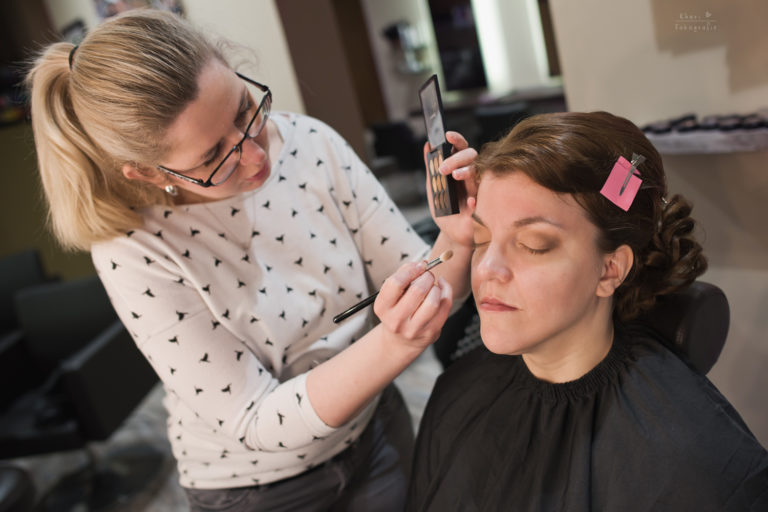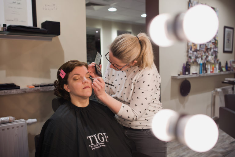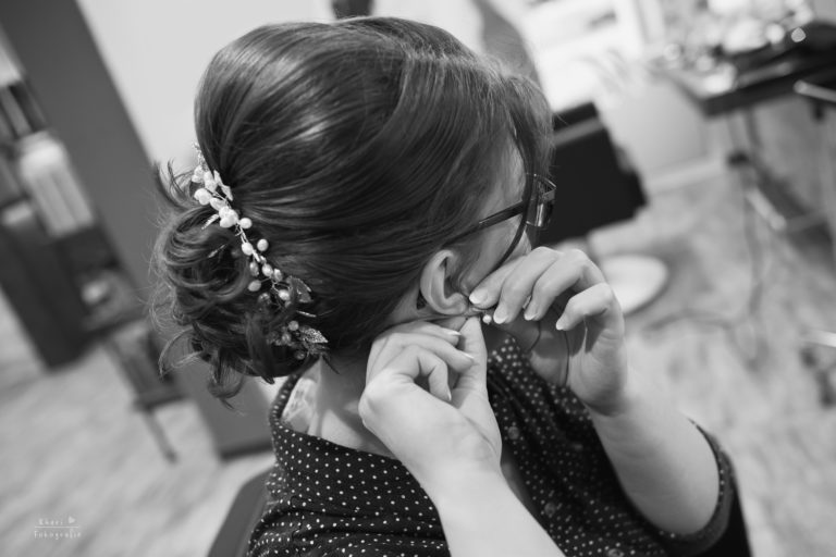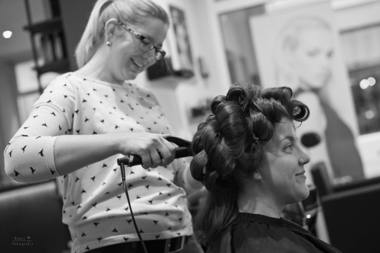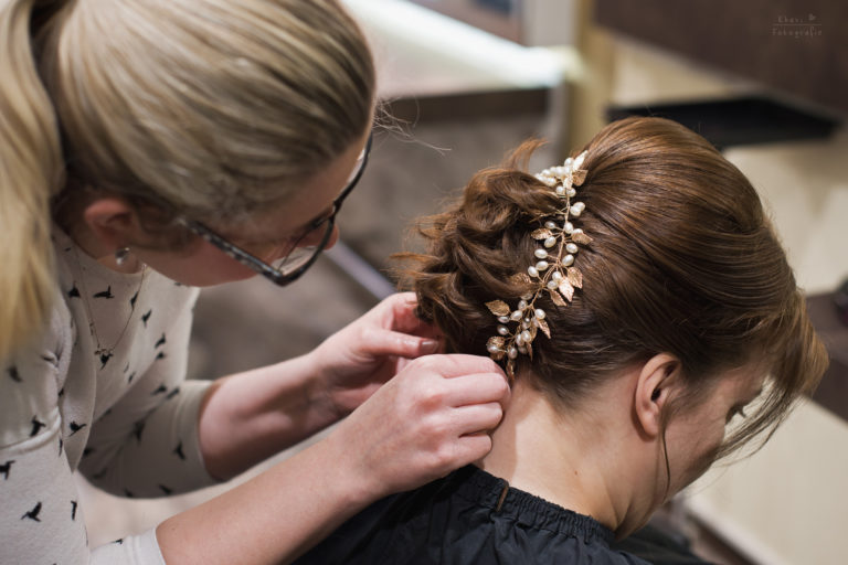 Der Tag begann beim Friseur mit dem Braut-Styling. Ich freue mich immer sehr darüber, wenn ich die Verwandlung fotografisch festhalten darf. Der Weg von meiner geliebten und gewohnten Anja zur Braut war auch für mich aufregend und spannend! Das tolle Styling hat die talentierte Maja von Miss Sophie gemacht. Anschließend ging es zu ihnen nach Hause und ich durfte höchstpersönlich Anja in ihr wunderschönes Spitzenkleid helfen. Natürlich mussten wir dafür sorgen, dass Anja und Micha sich nicht im Haus begegnen, denn sie wollten sich erst im Trausaal das erste mal sehen.