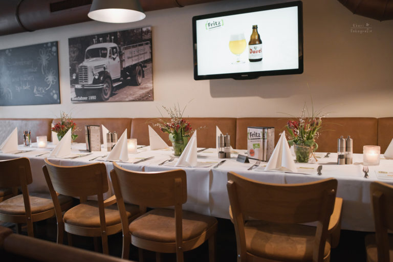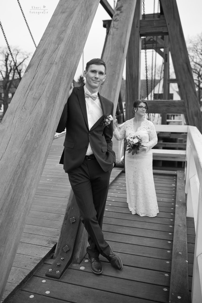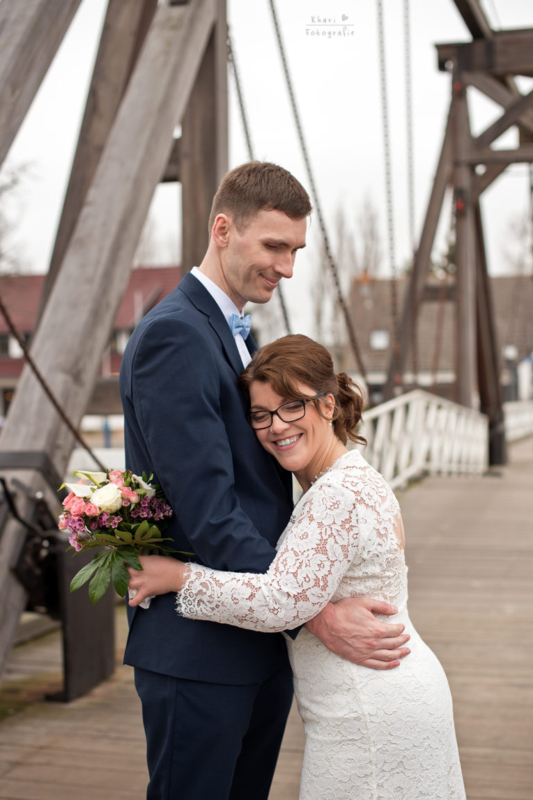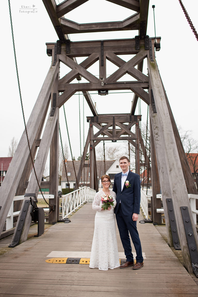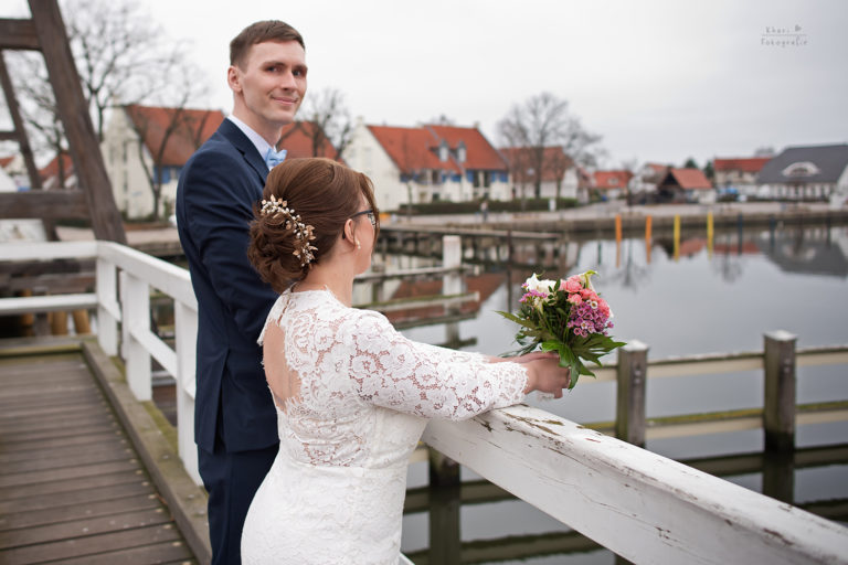 Danach haben wir in einem Restaurant nebenan angestoßen und sehr lecker Mittag á la Carte gegessen. Gut gestärkt ging es zum Fotoshooting mit Anja und Micha. Die schöne Kulisse vor dem Greifswalder Landesmuseum haben wir als erstes genutzt und danach fuhren wir nach Wiek/Eldena zu der schönen Klappbrücke und dem Utkiek. Die Hochzeit war im Winter und es waren ca. 11° draußen. Ich habe mich sehr gefreut, dass wir trotz der Kälte so viele schöne Fotos gemacht haben und das man auf den Fotos gar nicht erkennt, wie kalt es doch war. Bei unserem Shooting wurde außerdem so viel gelacht! Es war herrlich, weil sie einfach mal irgendwelche Faxen gemacht haben und die Situation und sich selbst nicht so ernst genommen haben. Auch so können natürliche und lebendige Fotos entstehen. Irgendwann waren die Beiden aber doch ganz schön durchgefroren, also ging es wieder zu ihnen nach Hause, wo die anderen Gäste den Tisch liebevoll gedeckt und ein leckeres Abendbuffet vorbereitet hatten. Vor allem die selbst gemachten Dessert Variationen haben mich schwer begeistert.