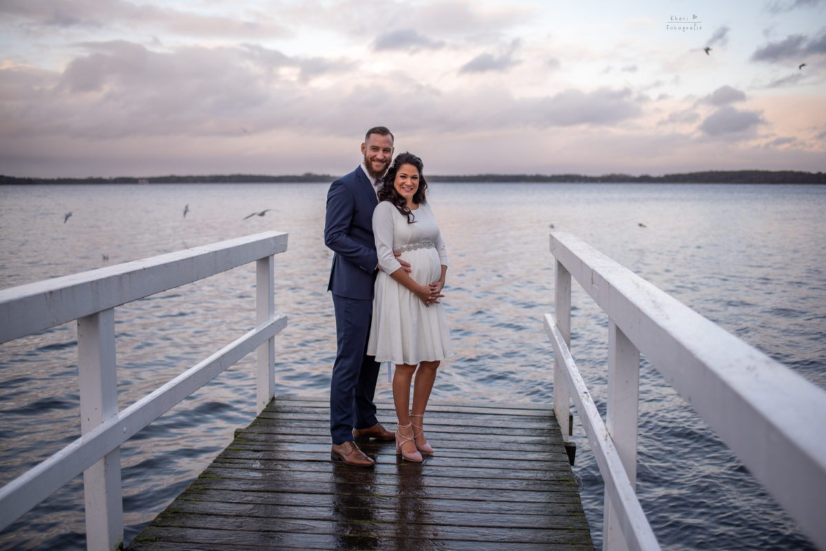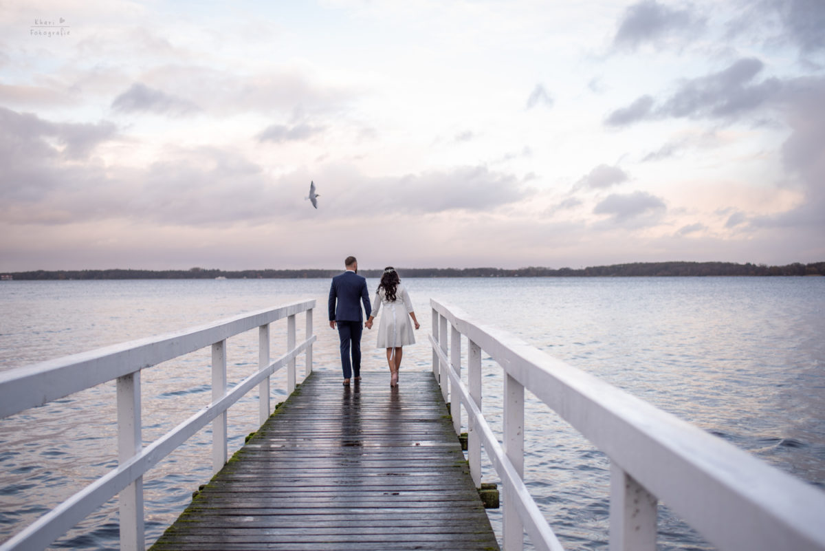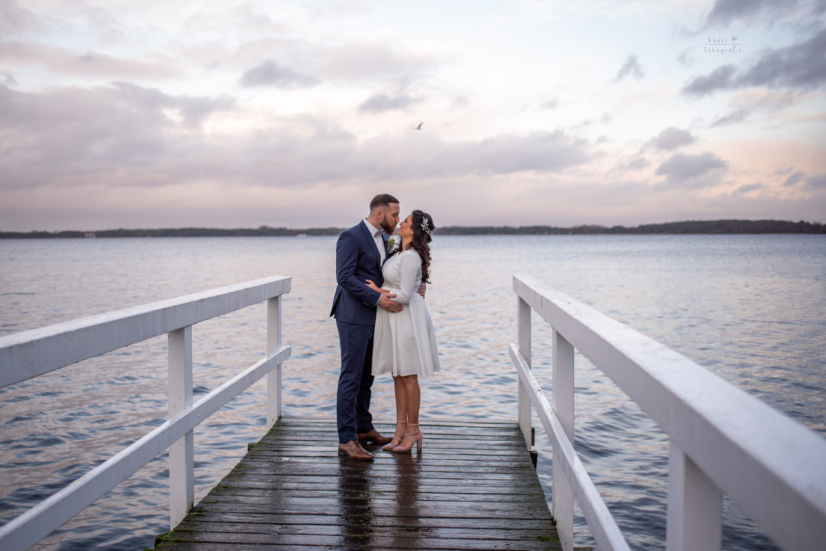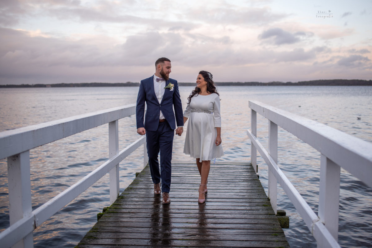 Nachdem die hochschwangere Iram souverän durch den Herzauschnitt getragen wurde (Kompliment an Daniel ;-)!) versammelten wir uns draußen für die Gruppenfotos und anschließend wollten wir die Paarfotos aufnehmen. Leider fing es an zu regnen aber ich wusste dank Regenradar App, dass es bald aufhören würde. Also besuchten wir das Café / Restaurant Oscar’s, welches praktischerweise direkt neben dem Trausaal, im selben Gebäude liegt. Nachdem der Regen sich verzogen hatte, schritten wir zur Tat und das Warten hatte sich absolut gelohnt. Das Licht war einfach traumhaft schön! Der nasse Boden glitzerte teilweise und die Wolken waren malerisch. Zu meiner riesen großen Freude haben wir einen Tannenbaum mit Lichterkette entdeckt. Ich bin ein ganz großer Weihnachtsfan und darum musste der natürlich mit rein in das Fotoshooting! Die kurze Shooting Zeit mit Iram und Daniel war einfach großartig. Wir haben uns ganz toll unterhalten, haben viel gelacht und sie waren vor der Kamera kreativ und auch entspannt.